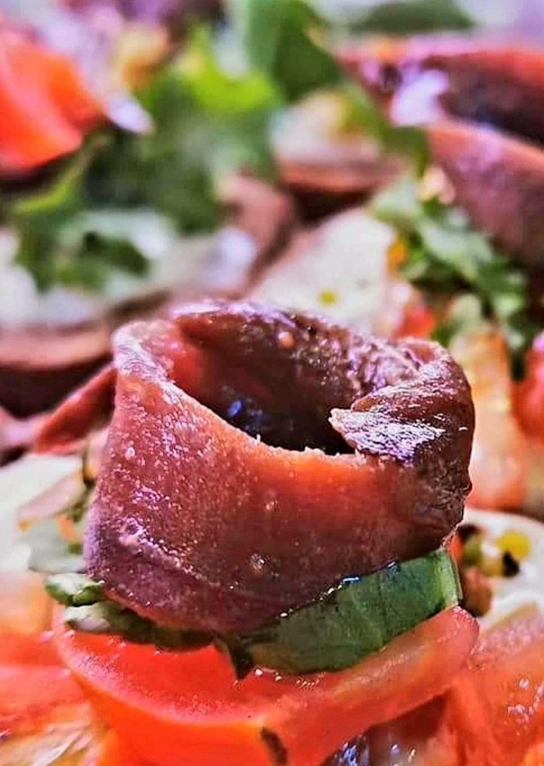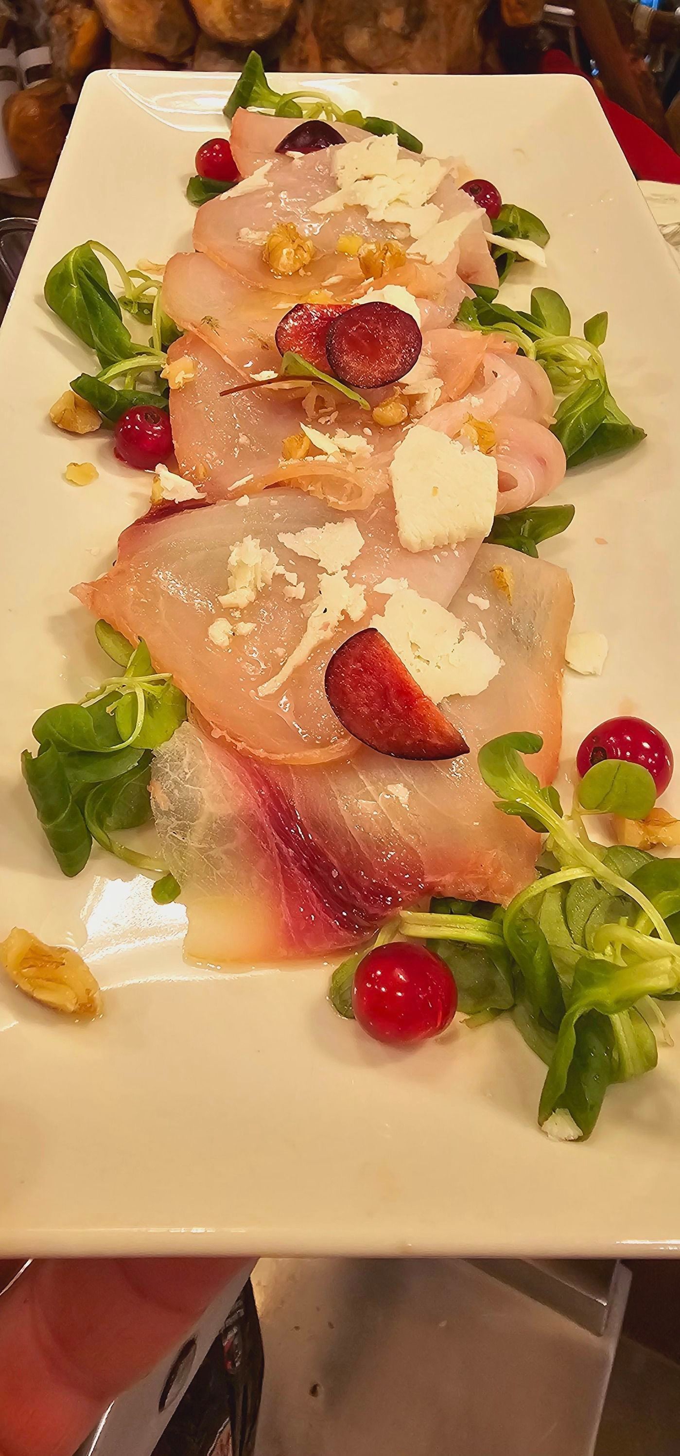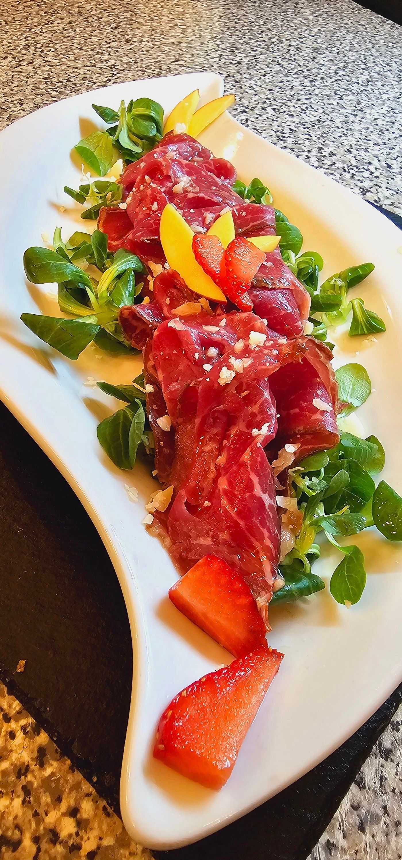 Filetto di Agnello affumicato,noci,ricotta,mustia di Desulo e scaglie di ciliegie.